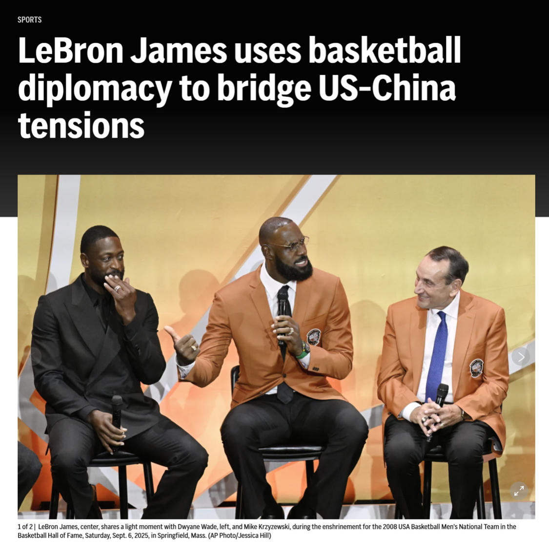 詹姆斯被央视总台采访已经是重磅效应,可他的形象和地位远不止于此。在詹姆斯都参加完名人堂以后,另一个中国权威机构《人民日报》在线上和纸质报纸都刊登了詹姆斯一篇标题为《篮球是连接彼此的桥梁》的文章,瞬间引爆舆论。詹姆斯连续被央视总台专访和在《人民日报》刊文,不仅出圈到国人震撼,中国驻美大使发动态好评,连国际上的各大权威也参与讨论,并且将这件事的规模提升到更宏观的中美关系上。
