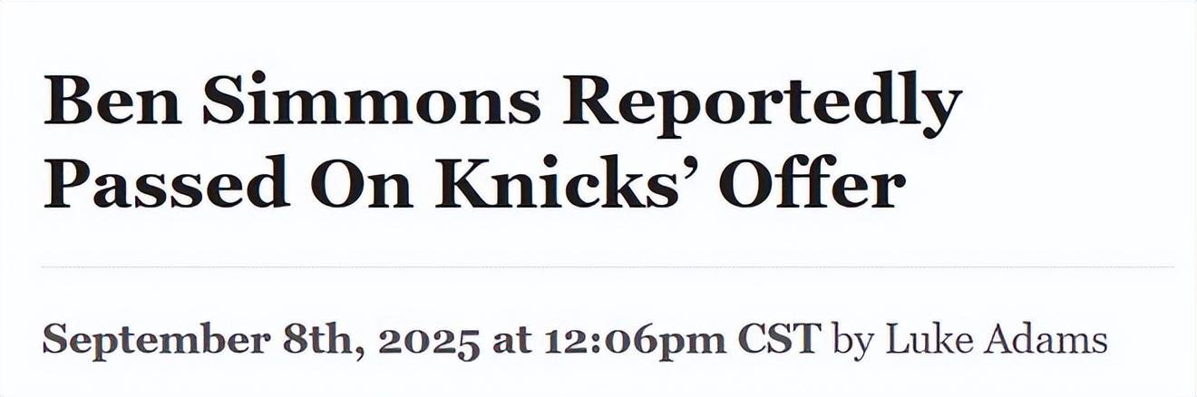 北京时间9月9日,NBA名记Stein报道,29岁的状元郎本西蒙斯收到了来自纽约尼克斯的一份邀约, 尼克斯希望跟他签下一份老将底薪合同,但是本西蒙斯觉得他的价值不应该只签底薪,于是拒绝了这份报价,同时表达了希望签约非底薪合同的意愿。这样一来,本西蒙斯仍然是自由球员,下赛季在哪里打球,能不能打球,都还不确定。