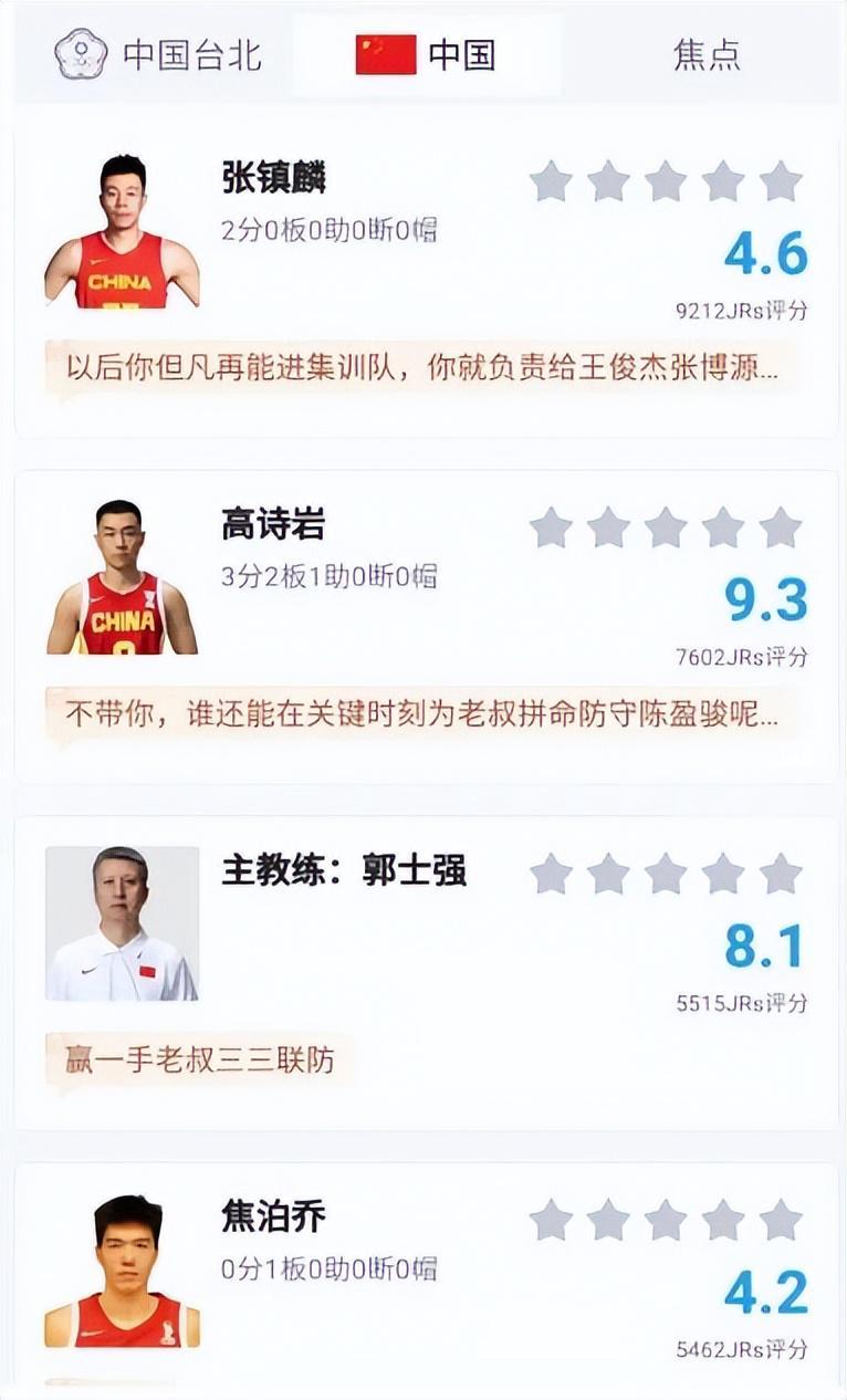 最后就是张镇麟、焦伯乔和王浩然三名球员了,这三人的评分都不算高,王浩然5.3分,张镇麟只有4.5分、焦伯乔也只有4.2分。王浩然的问题非常明显,就是经验方面还比较欠缺,这点只能慢慢积累。张镇麟这场比赛只出战了不到三分钟,1投1中得到了2分。郭士强之所以不敢再使用张镇麟是有原因的,他在和日本男篮的比赛中的表现实在是太差了。话说张镇麟也是国家队的老人了,目前这样的状态实在是太不应该。至于焦伯乔,他上场后的防守不错,还抢到了一个篮板球,但由于处理球毛躁造成了失误,还需要继续成长。